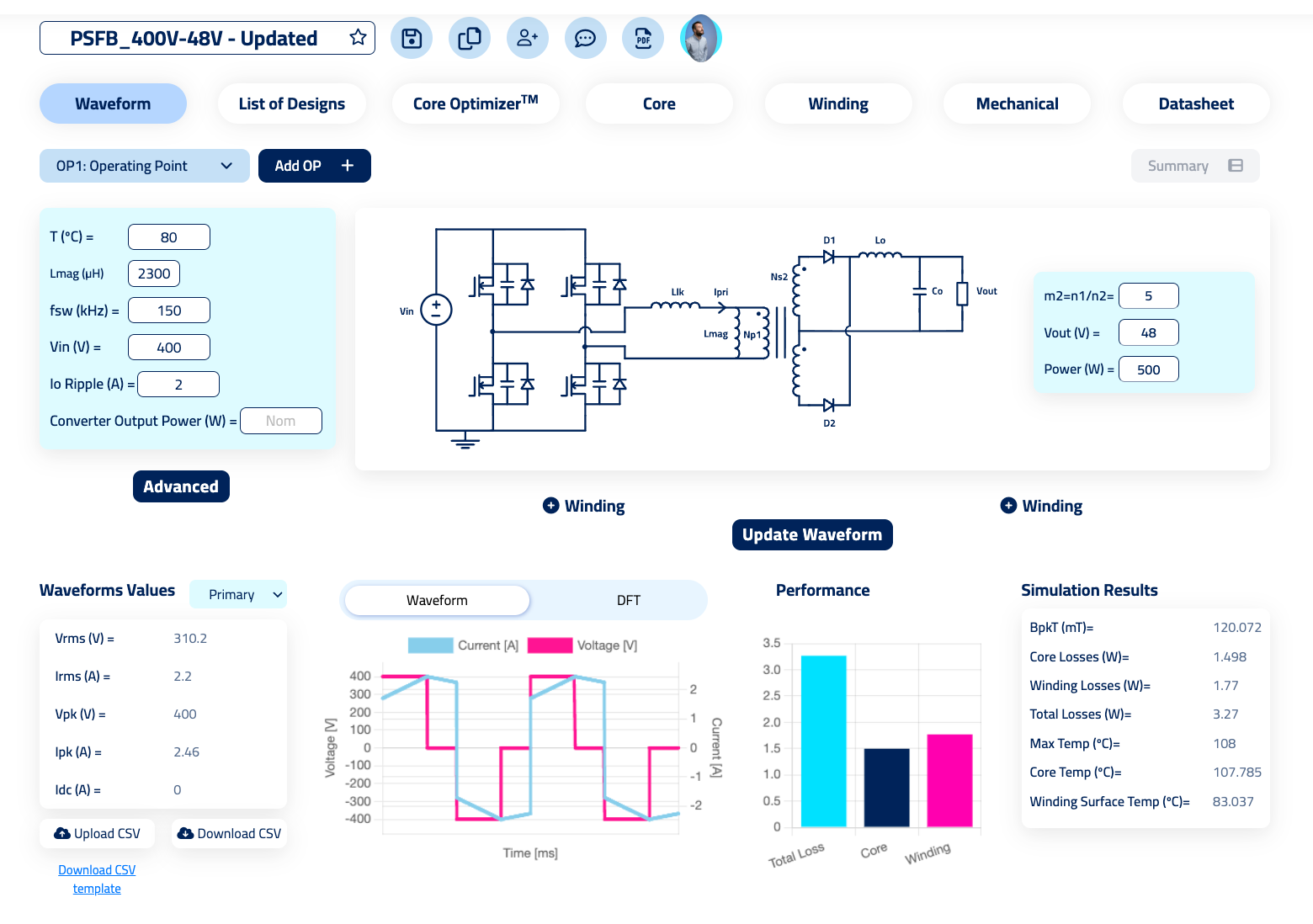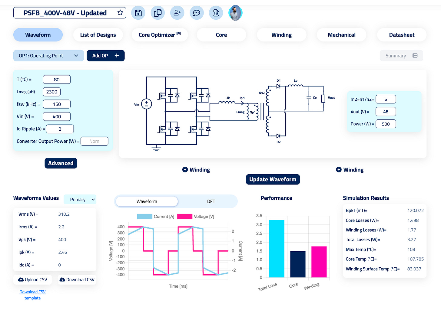 For me, the most interesting part of the software is the system for calculating losses. It uses Comsol online, so it’s running FEM simulations for you online without the need of having any software installed in your laptop.