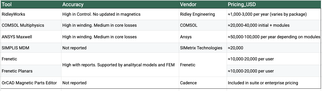 Accuracy: It’s a FEMM tool, high accuracy in winding losses if you use configure the simulations correctly. Medium-Low in core losses.